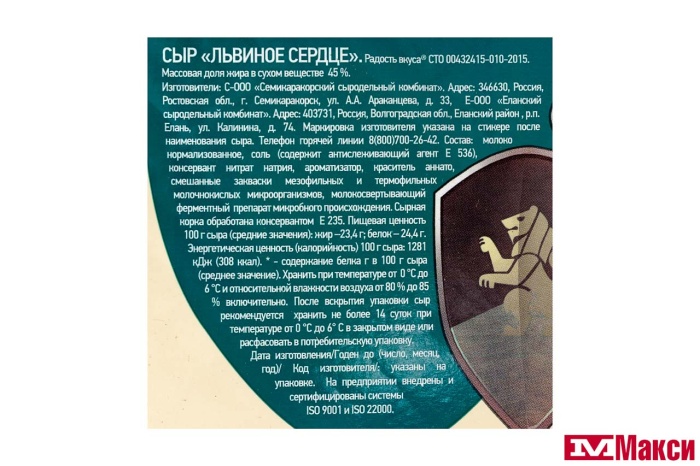 СЫР "ЛЬВИНОЕ СЕРДЦЕ" 40% (РАДОСТЬ ВКУСА) (БЗМЖ)[средн вес 9]