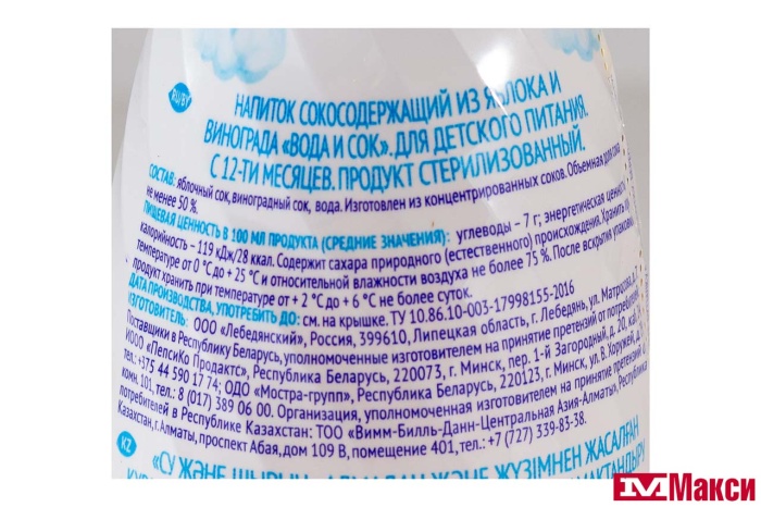 ВОДА ПИТЬЕВАЯ С СОКОМ "АГУША" В АССОРТИМЕНТЕ 0,3Л ПЛ/Б (ВИММ-БИЛЛЬ-ДАНН) (ДЕТСКОЕ ПИТАНИЕ)(яблоко-виноград)