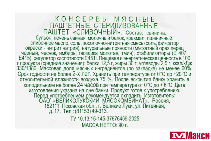 ПАШТЕТ "СЛИВОЧНЫЙ" 90Г (ВЕЛИКОЛУКСКИЙ МК)