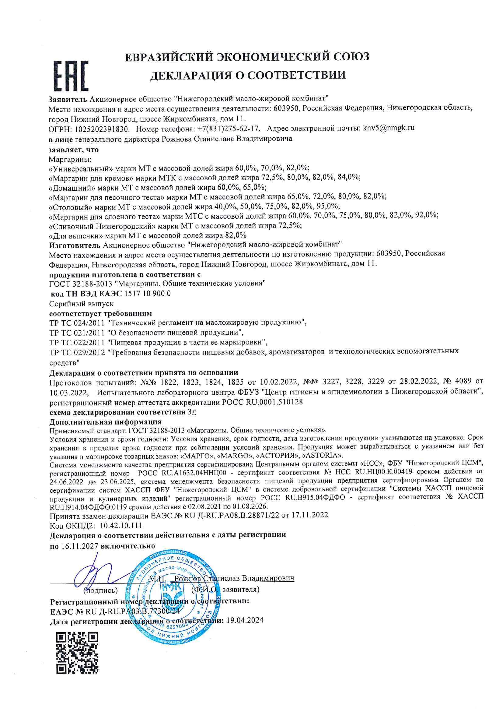 Масла растительные рафинированные дезодорированные, в том числе переэтерифицированные: пальмовое и его фракции, подсолнечное, кокосовое, вода, эмульгаторы (Е471, Е475), соль, антиокислители (Е304i, ЕЗ06b), консервант (сорбат калия), регулятор кислотности (лимонная кислота), ароматизатор, красители (Е100, Е160b).