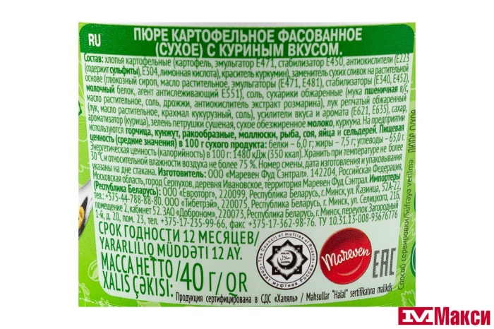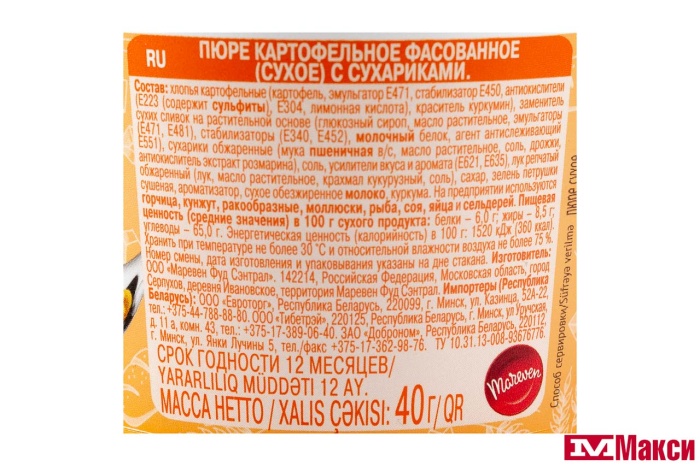 ПЮРЕ КАРТОФЕЛЬНОЕ БЫСТРОГО ПРИГОТОВЛЕНИЯ "КУНЦЕВО" 40Г(с луком и сухариками)