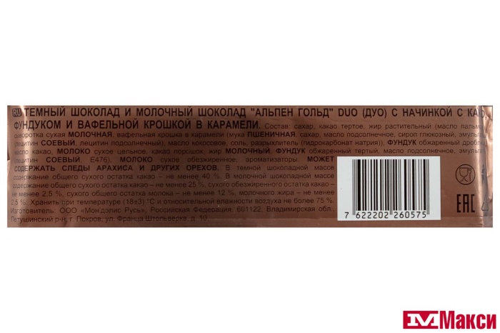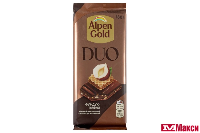 ШОКОЛАД "АЛЬПЕН ГОЛД" DUO С НАЧИНКОЙ ФУНДУК-ВАФЛЯ 130Г (МОН'ДЭЛИС РУСЬ)