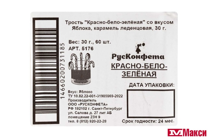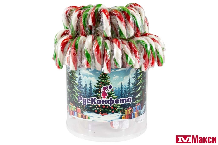 КАРАМЕЛЬ "ТРОСТЬ КРАСНО-БЕЛО-ЗЕЛЕНАЯ" ЯБЛОКО 30Г (РУСКОНФЕТА)