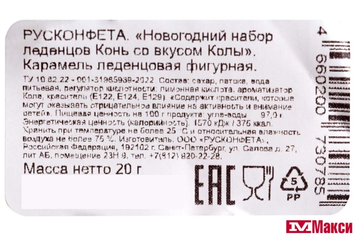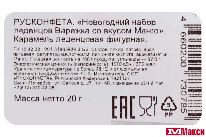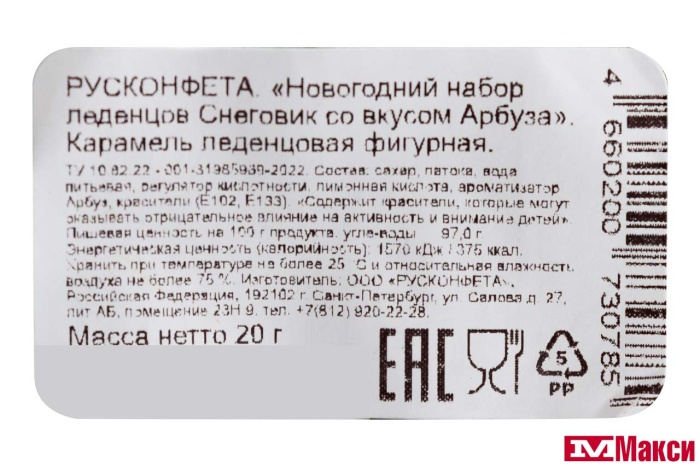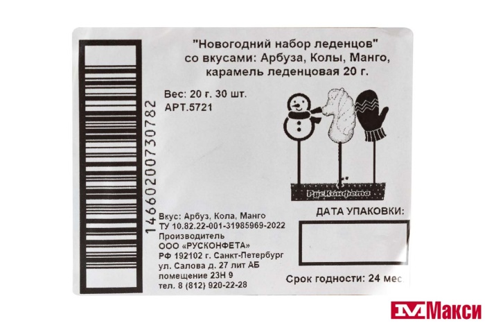 КАРАМЕЛЬ "НОВОГОДНИЙ НАБОР ЛЕДЕНЦОВ" АРБУЗ, КОЛА, МАНГО 20Г (РУСКОНФЕТА)