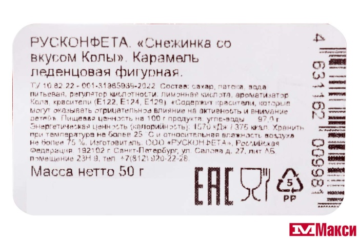 КАРАМЕЛЬ "СНЕЖИНКА" 50Г (РУСКОНФЕТА)