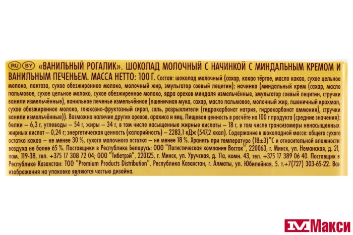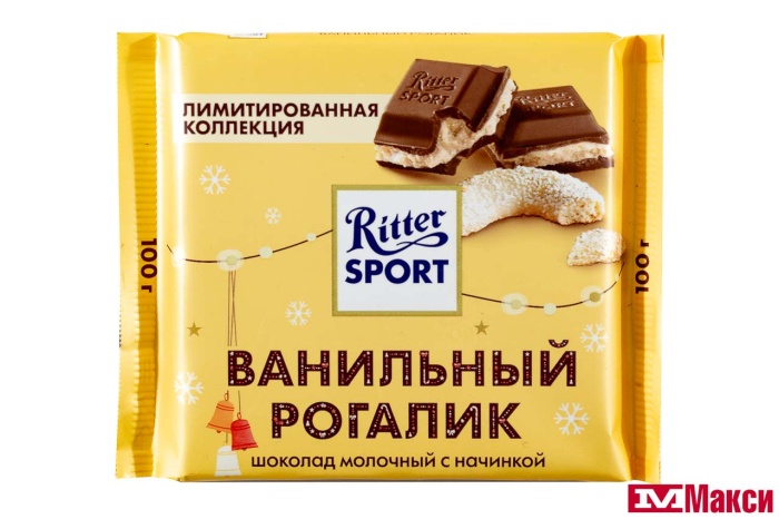 ШОКОЛАД "РИТТЕР СПОРТ" ВАНИЛЬНЫЙ РОГАЛИК МОЛОЧНЫЙ 100Г