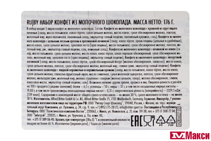 ШОКОЛАДНЫЕ КОНФЕТЫ "РИТТЕР СПОРТ" SHOKO GRUSS 176Г