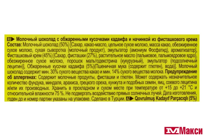 ШОКОЛАД "MILANGO" МОЛОЧНЫЙ С КУСОЧКАМИ КАДАИФА И НАЧИНКОЙ ИЗ ФИСТАШКОВОГО КРЕМА 122Г (ТУРЦИЯ)