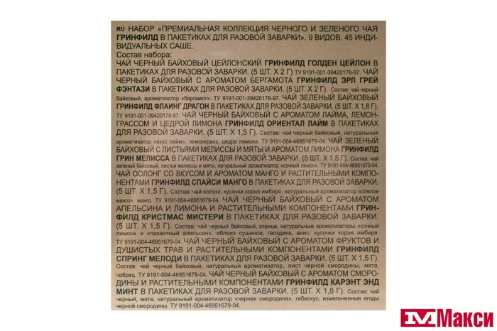 ЧАЙ "GREENFIELD" PREMIUM TEA COLLECTION 9 ВИДОВ 45ПАК 75,5Г (ОРИМИ-ТРЭЙД)