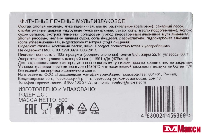 ПЕЧЕНЬЕ "ФИТЧЕНЬЕ" МУЛЬТИЗЛАКОВОЕ 500Г (ПРОПОЛЬЗУ)