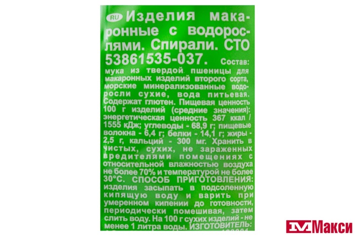 МАКАРОННЫЕ ИЗДЕЛИЯ "WELLNESS" С ВОДОРОСЛЯМИ СПИРАЛИ 400Г (МАКФА)