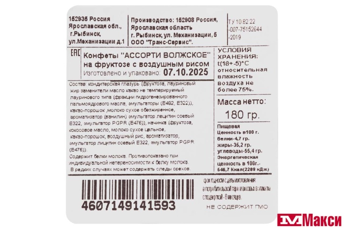 ШОК.КОНФ. (РЫБИНСК) "АССОРТИ ВОЛЖСКОЕ" С ВОЗД.РИСОМ НА ФРУКТОЗЕ 180Г