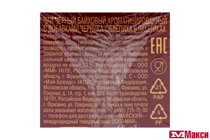 ЧАЙ "МАЙСКИЙ" ЧЕРНИКА-ОБЛЕПИХА ЧЕРНЫЙ 25ПАКЕТИКОВ (МАЙ)