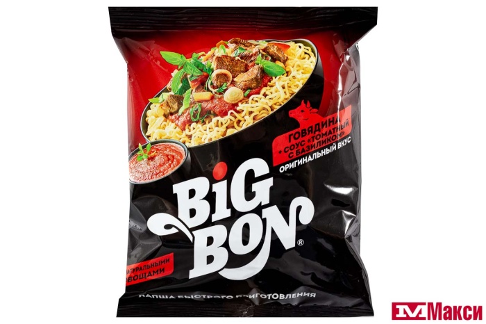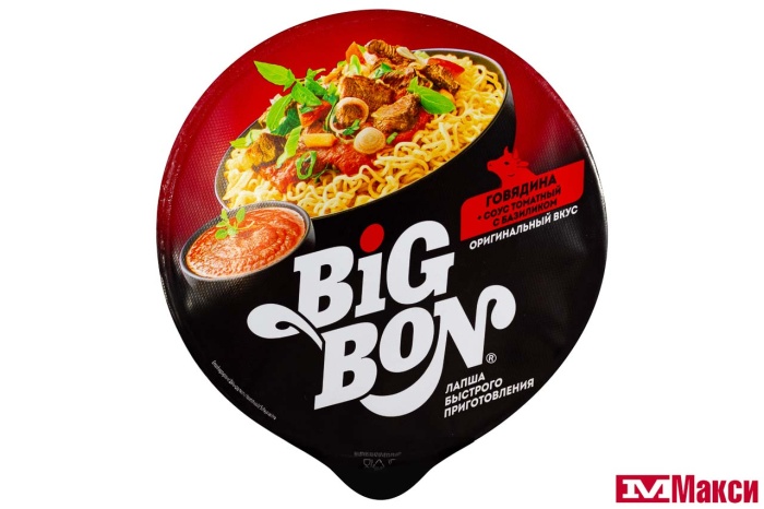 ЛАПША БЫСТРОГО ПРИГОТОВЛЕНИЯ "БИГ БОН" 75Г(говядина+соус "томатный")