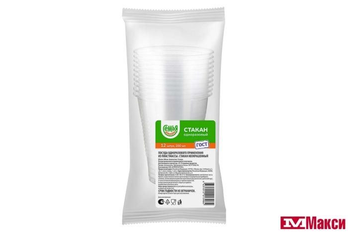 СТАКАН ОДНОРАЗОВЫЙ ПРОЗРАЧНЫЙ 200МЛ 12ШТ (СЕМЬЯ ДОВОЛЬНА)