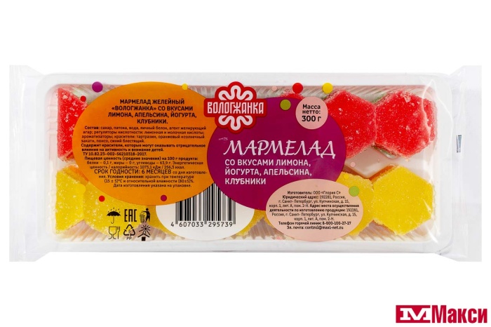 МАРМЕЛАД "ВОЛОГЖАНКА" МИКС: ЛИМОН, АПЕЛЬСИН, КЛУБНИКА, ЙОГУРТ 300Г