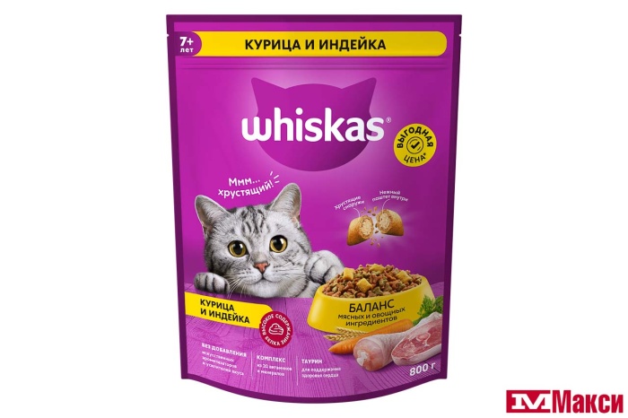 КОРМ ДЛЯ КОШЕК "ВИСКАС" С НЕЖНЫМ ПАШТЕТОМ СУХОЙ 800Г(с курицей и индейкой/для кошек старше 7 лет)