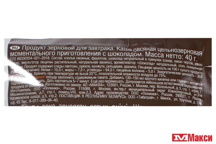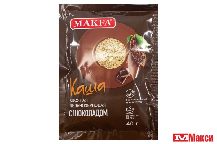 КАША БЫСТРОГО ПРИГОТОВЛЕНИЯ "МАКФА" ОВСЯНАЯ ЦЕЛЬНОЗЕРНОВАЯ С ШОКОЛАДОМ 40Г