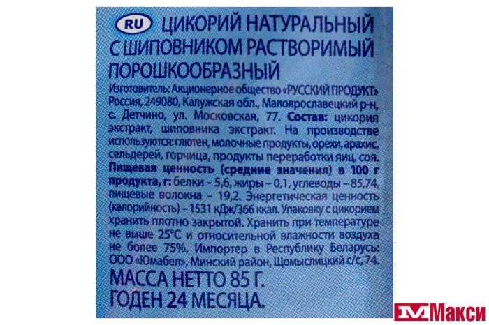 100% экстракт цикория. На производстве используются: глютен, молочные продукты, орехи, арахис, сельдерей, горчица, продукты переработки яиц, соя