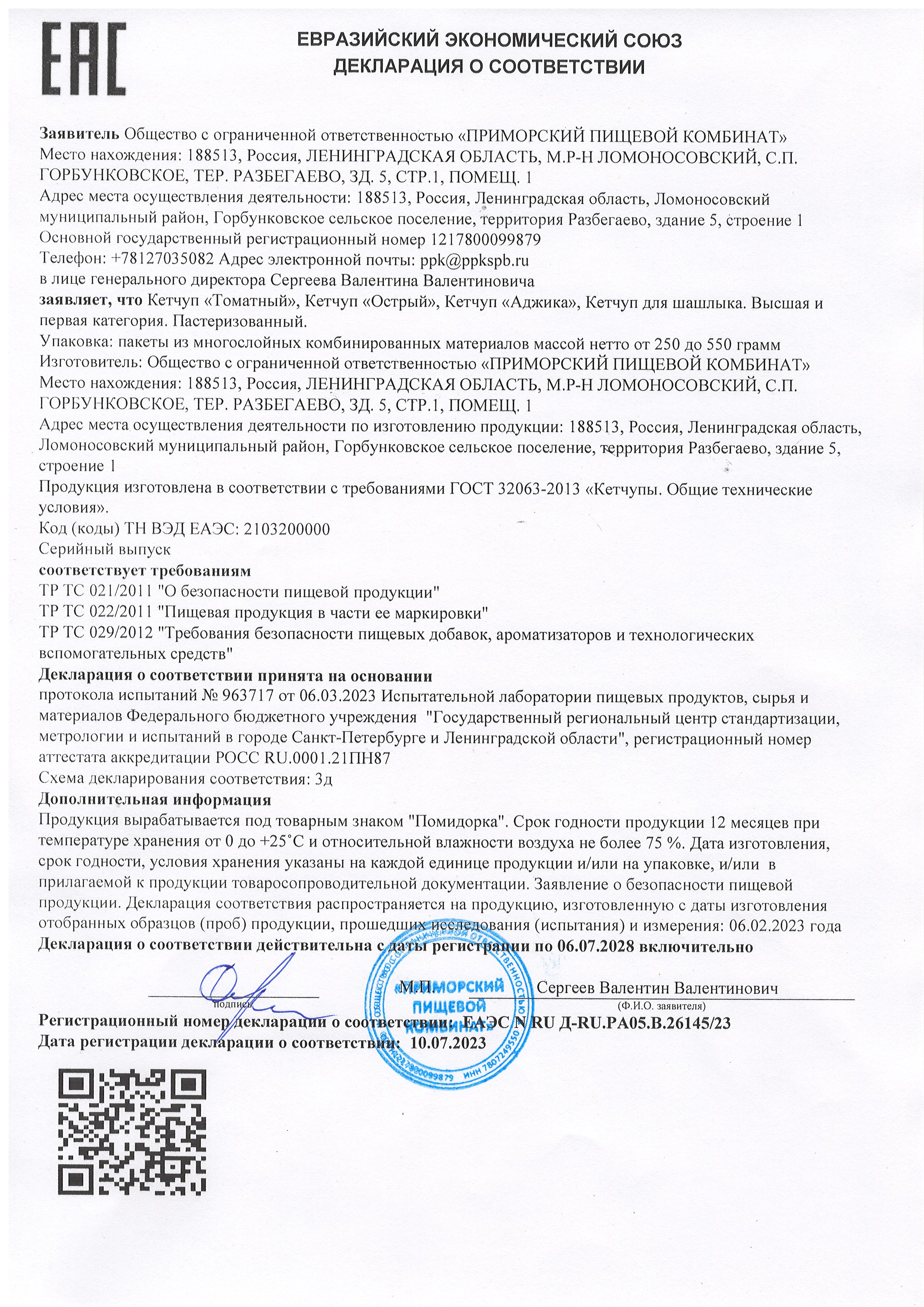 Кетчуп ПОМИДОРКА изготавливается на одной из лучших и современных производственных площадок в России, только натуральные ингредиенты, нет загустителей, стабилизаторов, ароматизаторов и консервантов. Высшей категории.