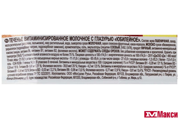 ПЕЧЕНЬЕ САХАРНОЕ С ГЛАЗУРЬЮ "ЮБИЛЕЙНОЕ" 116Г (МОН' ДЭЛИС РУСЬ)(молочное в глазури)