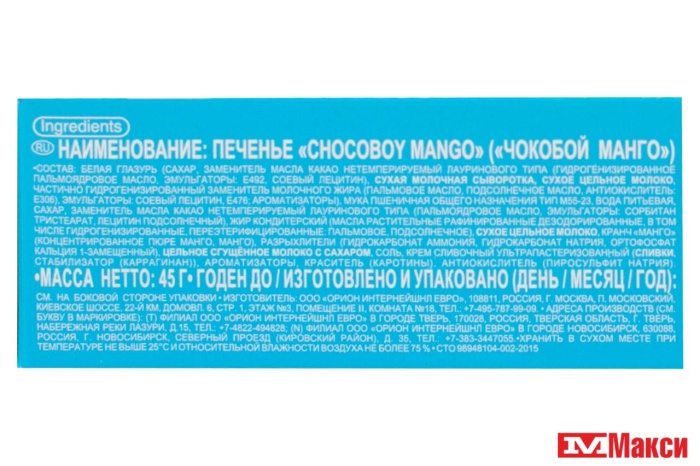 ПЕЧЕНЬЕ "ЧОКО БОЙ" МАНГО 45Г (ОРИОН)