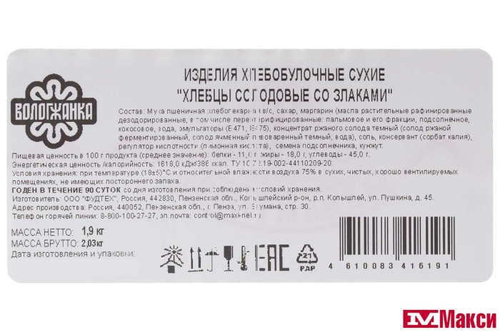 ИЗДЕЛИЕ ХЛЕБОБУЛОЧНОЕ ХЛЕБЕЦ СОЛОДОВЫЙ СО ЗЛАКАМИ (ВОЛОГЖАНКА)