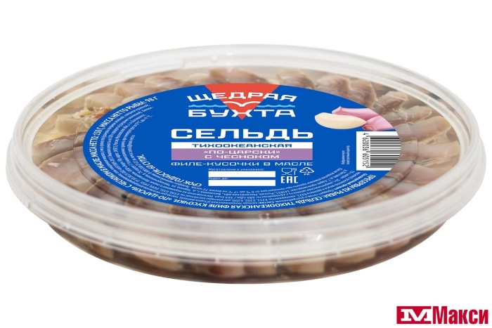 ПРЕСЕРВЫ СЕЛЬДЬ "ПО-ЦАРСКИ С ЧЕСНОКОМ" ФИЛЕ-КУСОЧКИ В МАСЛЕ СЛАБОЙ СОЛИ 150Г (ЩЕДРАЯ БУХТА)