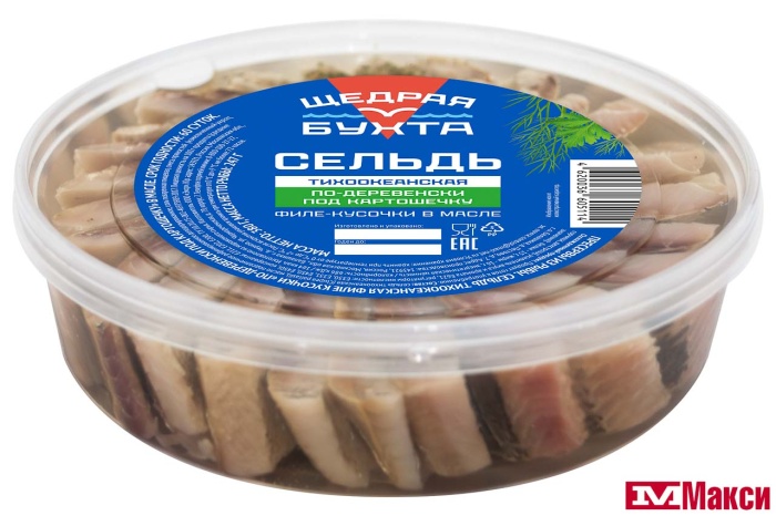 ПРЕСЕРВЫ (ЩЕДРАЯ БУХТА) СЕЛЬДЬ "ПО-ДЕРЕВЕНСКИ ПОД КАРТОШЕЧКУ" ФИЛЕ-КУСОЧКИ В МАСЛЕ С/С 380Г