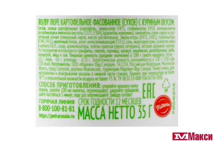 ПЮРЕ КАРТОФЕЛЬНОЕ БЫСТРОГО ПРИГОТОВЛЕНИЯ "ПЕТРА" В АССОРТИМЕНТЕ 35Г (РОЛЛТОН)(курица)