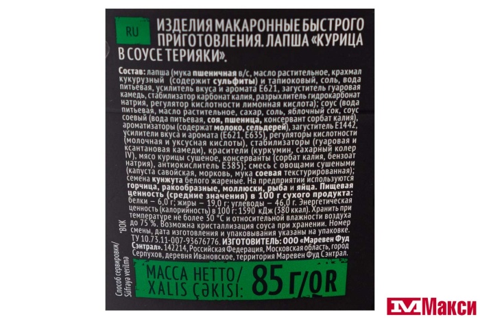 ЛАПША БЫСТРОГО ПРИГОТОВЛЕНИЯ "БИГ БОН WOK" 85Г(курица в соусе "терияки")