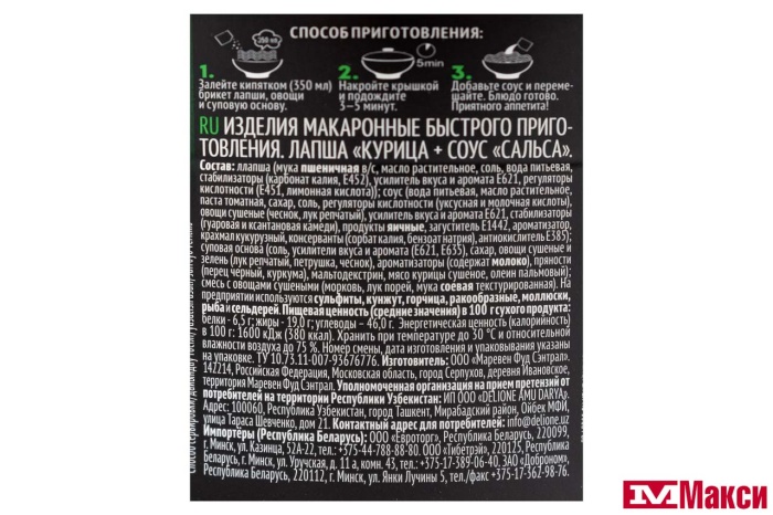 ЛАПША БЫСТРОГО ПРИГОТОВЛЕНИЯ "БИГ БОН" 75Г(курица+соус"сальса")