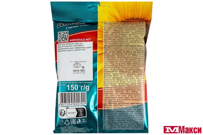 СЕМЕЧКИ "ЁШКИ-МАТРЁШКИ" ПОЛОСАТЫЕ ЖАРЕНЫЕ С СОЛЬЮ 150Г