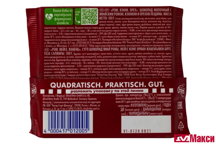 ШОКОЛАД "РИТТЕР СПОРТ" РОМ-ИЗЮМ-ОРЕХ 100Г