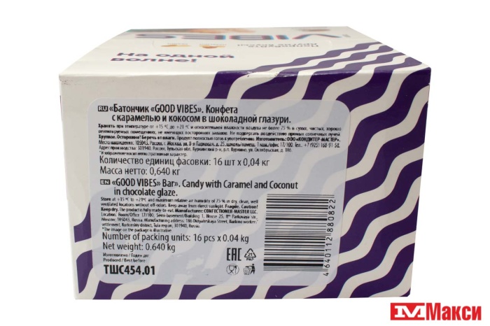 ШОКОЛАДНЫЙ БАТОНЧИК "GOOD VIBES" С КАРАМЕЛЬЮ И КОКОСОМ В ШОКОЛАДНОЙ ГЛАЗУРИ 40Г (КОНДИТЕР-МАСТЕР)