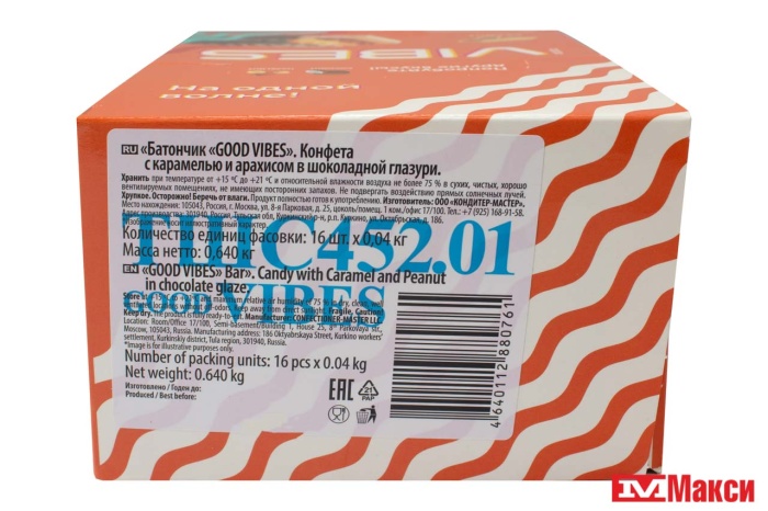 ШОКОЛАДНЫЙ БАТОНЧИК "GOOD VIBES" С КАРАМЕЛЬЮ И АРАХИСОМ В ШОКОЛАДНОЙ ГЛАЗУРИ 40Г (КОНДИТЕР-МАСТЕР)