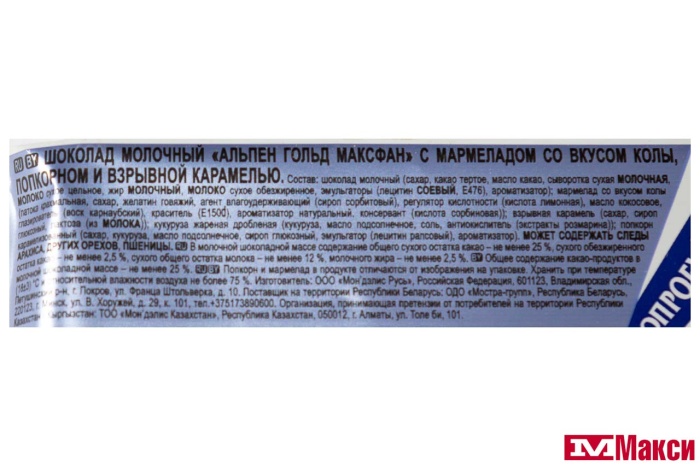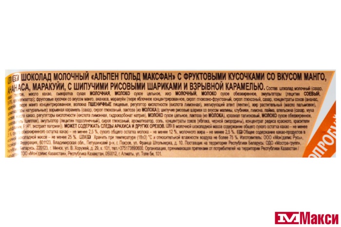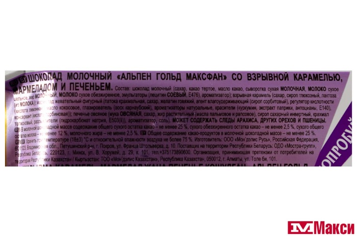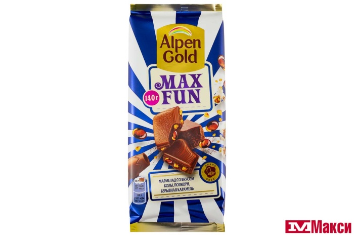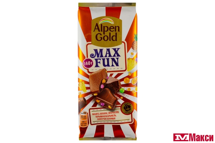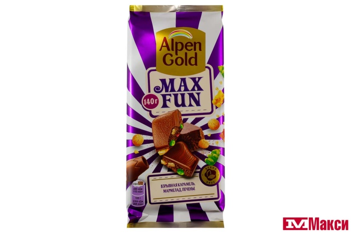 ШОКОЛАД "АЛЬПЕН ГОЛД" МАКСФАН МОЛОЧНЫЙ СО ВЗРЫВНОЙ КАРАМЕЛЬЮ,МАРМЕЛАДОМ И ПЕЧЕНЬЕМ 140Г (МОН' ДЭЛИС РУСЬ)
