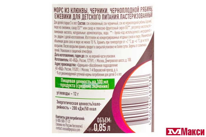 МОРС "J-7" ИЗ КЛЮКВЫ,ЧЕРНИКИ,ЧЕРНОПЛОДНОЙ РЯБИНЫ,ЕЖЕВИКИ 0,85Л ПЭТ (ВБД)
