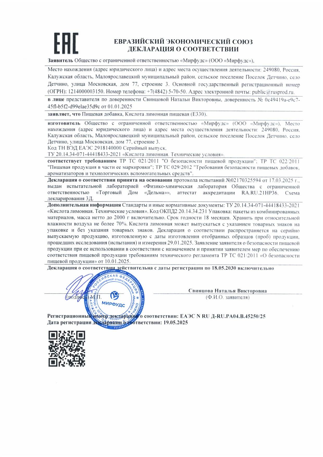 Кислота лимонная моногидрат пищевая (Е330).