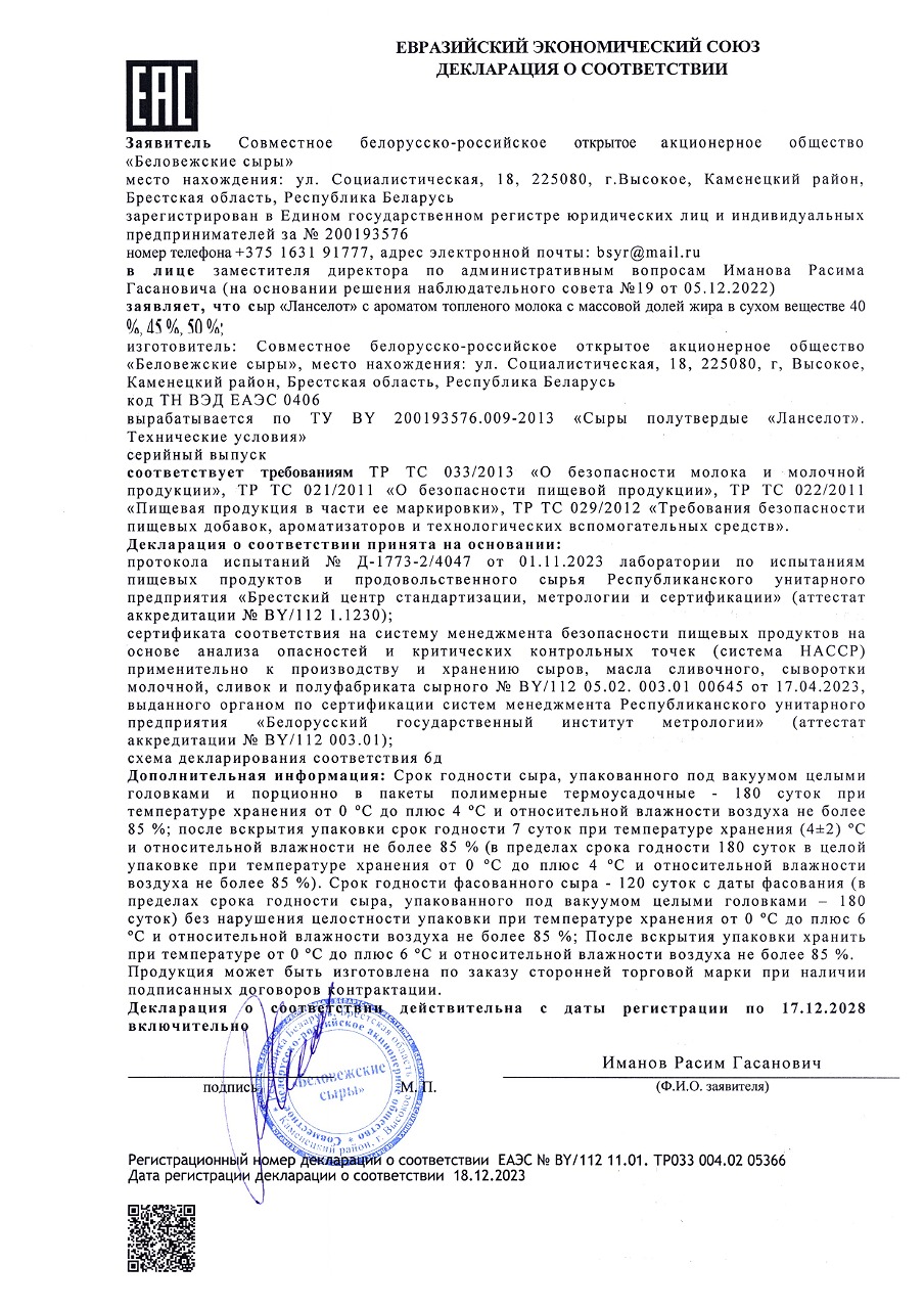 Сыр Ланселот с ароматом топлёного молока 45 % словно возвращает в детство! Идеальный сырный вкус, знакомый с советских времен, когда не знали о никаких заменителях, оттененный ароматом топленого молока – да-да, того самого, с пенкой. В сочетании с легкой кислинкой мы получаем идеальный и неповторимый вкус сыра «Ланселот». Он станет отличным дополнением к белому и красному полусухому вину, сочетается с виноградом и другими фруктами, идеален в качестве ингредиента для бутерброда и французских сырных булочек.