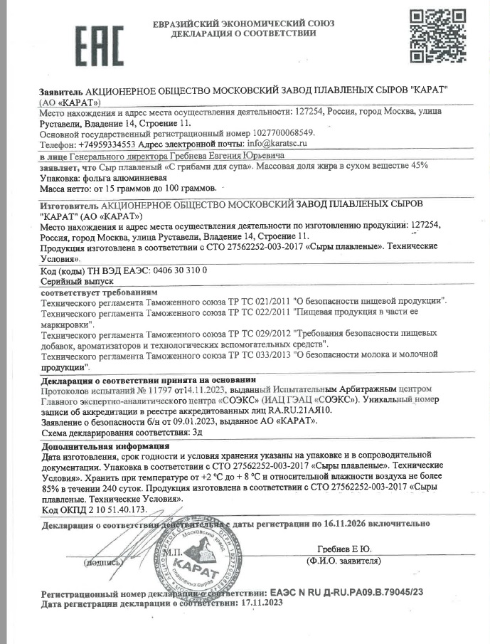 «Карат» с грибами — плавленый сыр из выдержанных головок полутвердого сыра с добавлением натурального творога, цельного молока и кусочков настоящих грибов. Сыр идеально подойдет для приготовления сытных супов на обед и сливочных соусов для горячего — он придаст блюду нежную текстуру и добавит благородную грибную нотку.