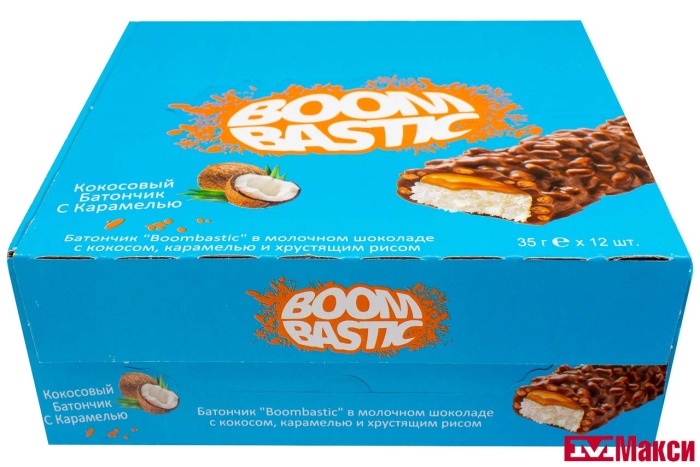 БАТОНЧИК ВАФЕЛЬНЫЙ "BOOMBASTIC" В МОЛОЧНОМ ШОКОЛАДЕ С КОКОСОМ,КАРАМЕЛЬЮ И ХРУСТЯЩИМ РИСОМ 32Г (SOLEN)