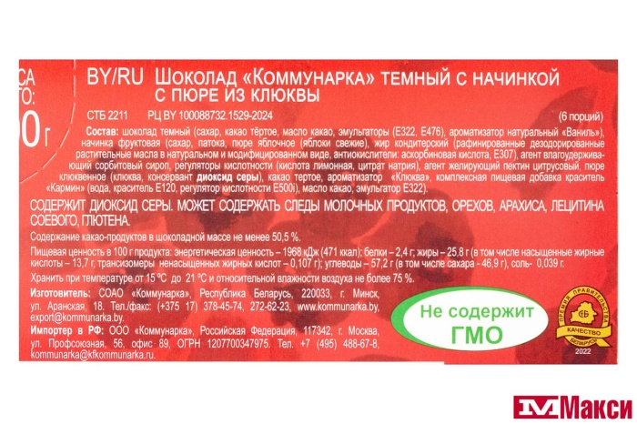 ШОКОЛАД ТЕМНЫЙ С НАЧИНКОЙ ПЮРЕ ИЗ КЛЮКВЫ 100Г (КОММУНАРКА)