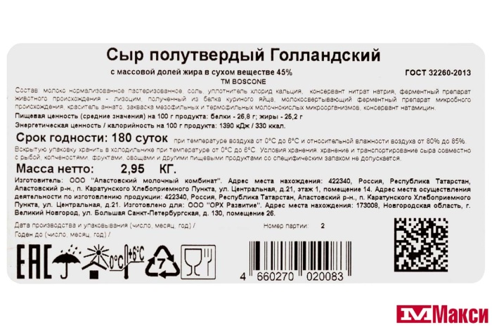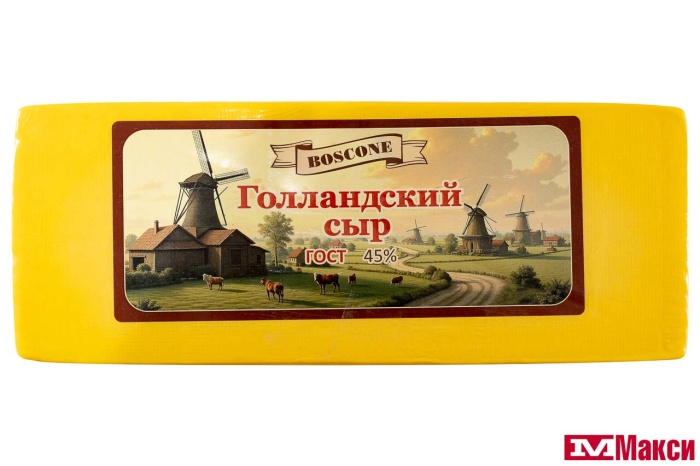 СЫР "ГОЛЛАНДСКИЙ" 45% БРУС (BOSCONE) (БЗМЖ)[средн вес 4]