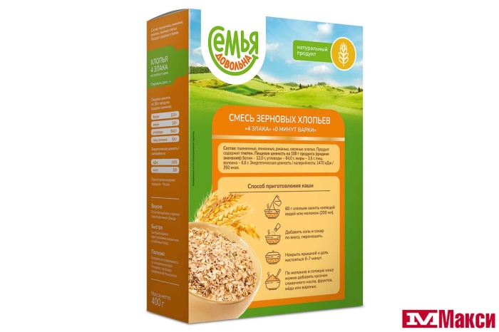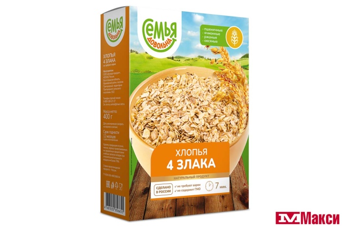 ХЛОПЬЯ "СЕМЬЯ ДОВОЛЬНА"4 ЗЛАКА БЫСТРОГО ПРИГОТОВЛЕНИЯ 400Г